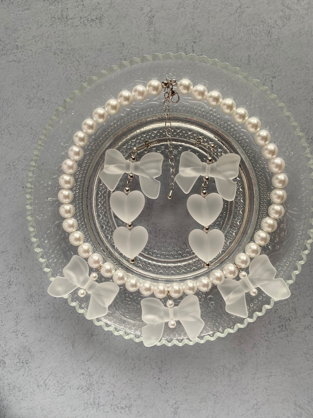 優しい光沢のパールビーズと、オーロラに輝くクリアなリボンチャーム、そして氷のようなクリアハートの耳飾りのセットです。